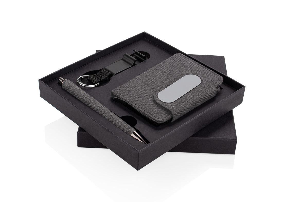 Set de oficina elegante y sostenible. Incluye tarjetero metálico forrado en tela RPET (7,3 X...