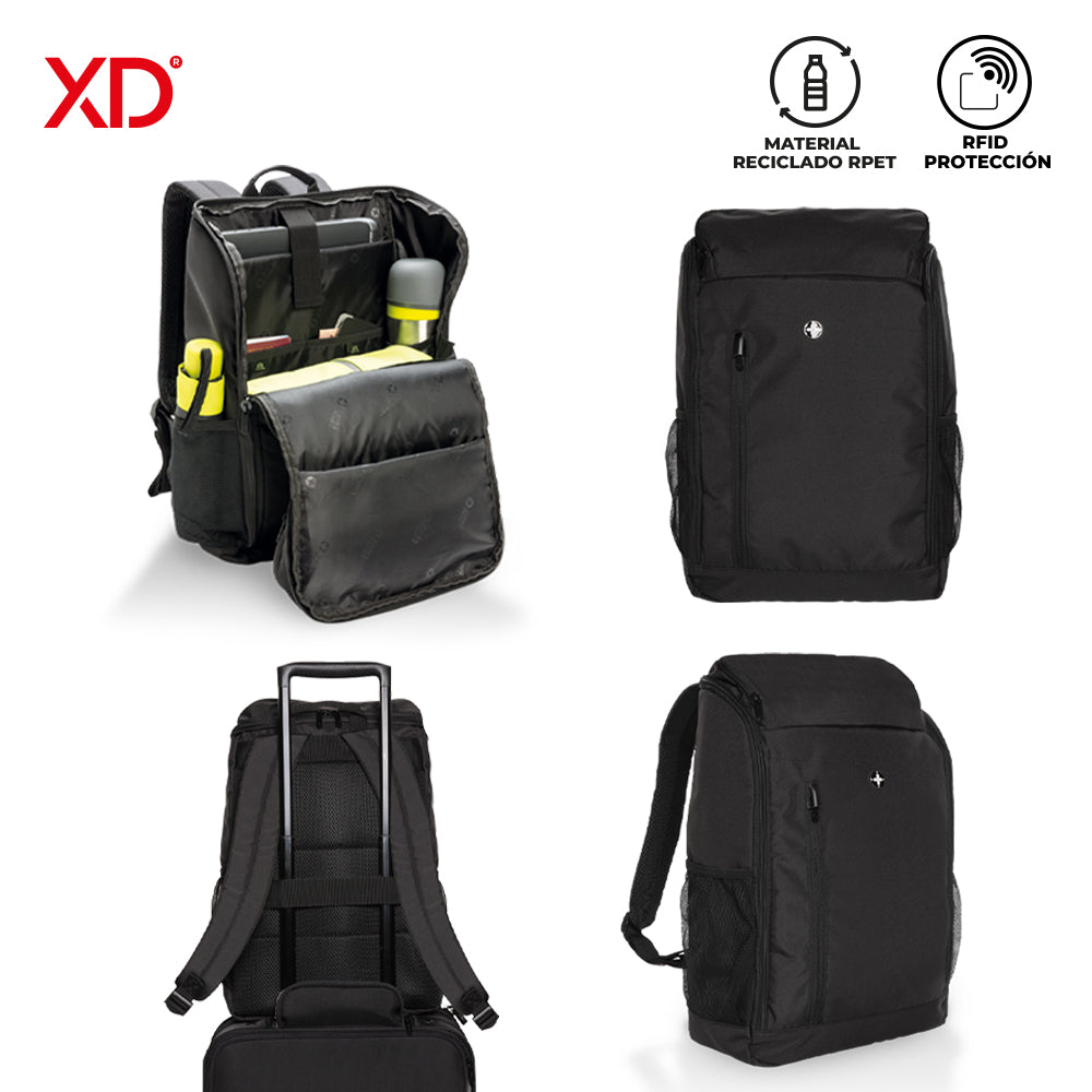 Morral backpack en poliéster y poliuretano reciclado RPET. Con cinco bolsillos externos con cremallera. Apto...