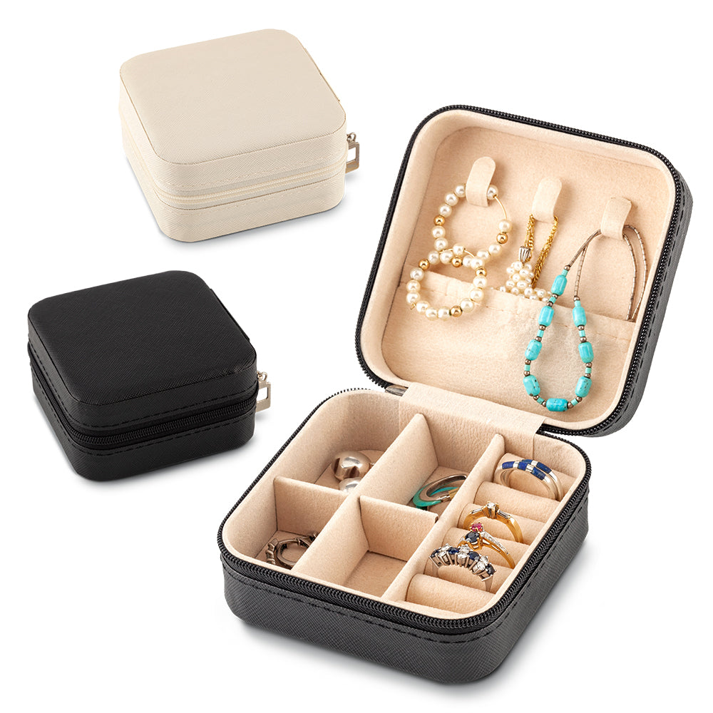 Joyero en imitación cuero con cremallera. La parte superior interna tiene 3 ganchos y un...