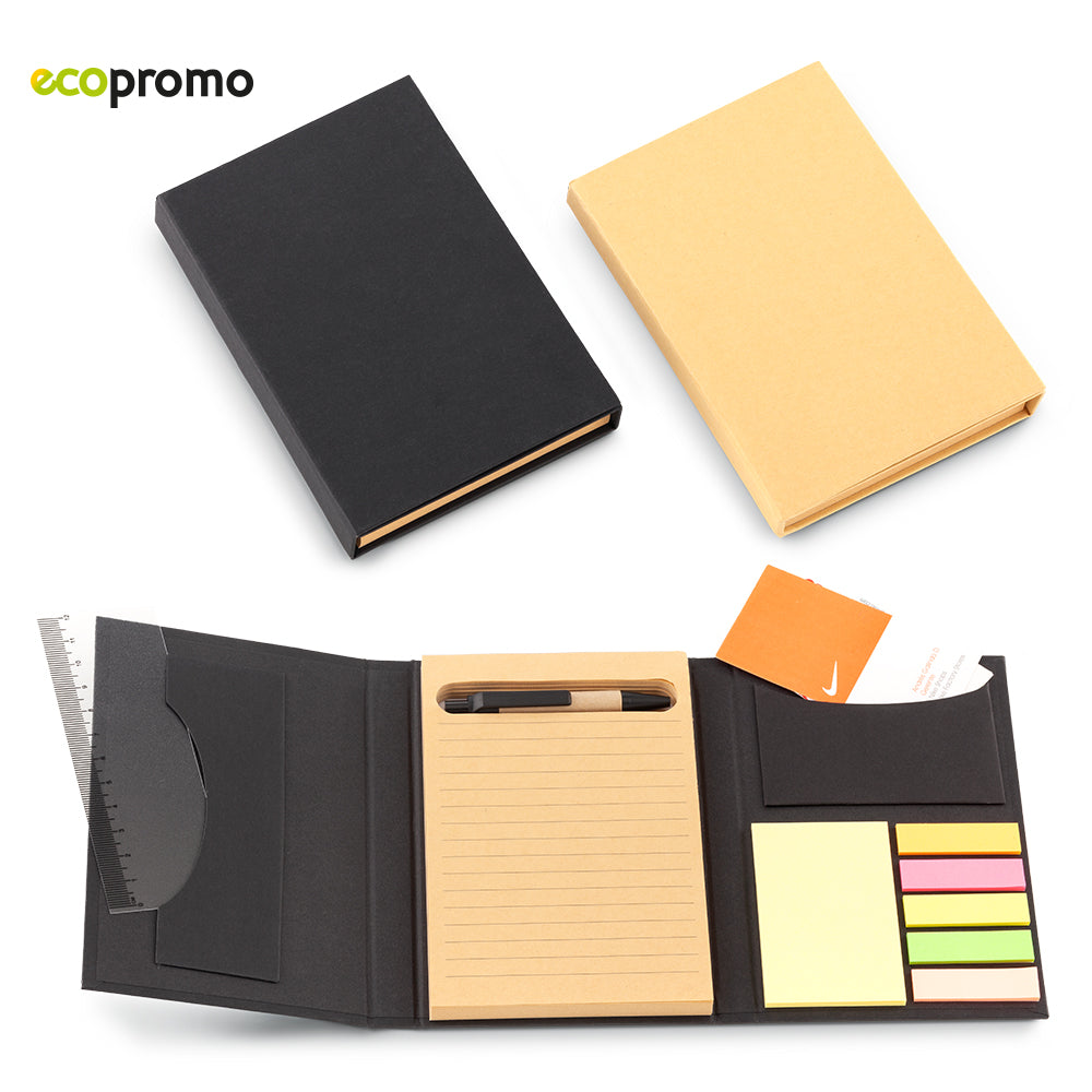 Libreta en cartón, 80 hojas rayadas recicladas.Mini esfero ecológico en cartón. 5 stickies en colores...