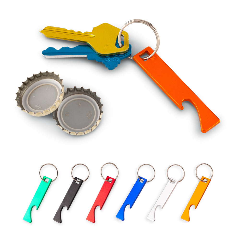 Llavero destapador en aluminio.Medidas: 6.5 cm x 2.5 cm.Marca: 1 cm / Tampografía.