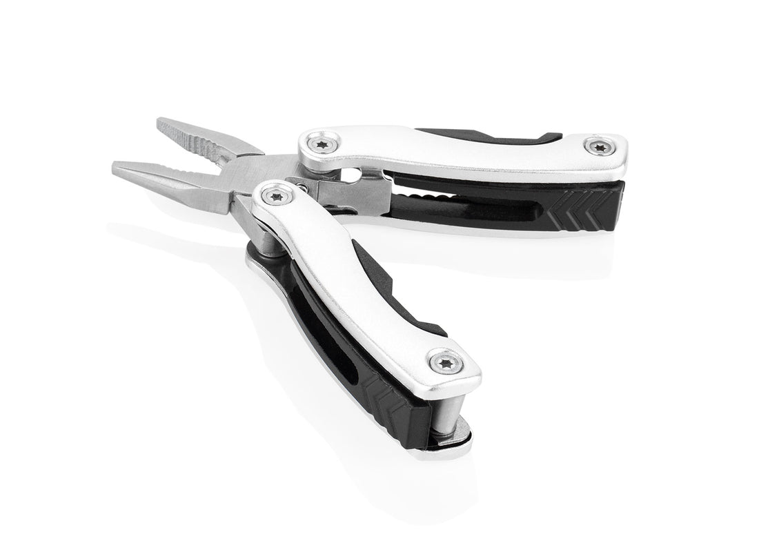 Multiherramientero metálico con llavero. 13 funciones, algunas de ellas son: destornillador plano y de estrella,...
