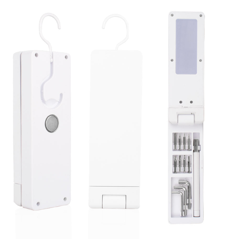 Mini set de herramientas multifuncional con luz LED.Incluye argolla tipo llavero y estuche para cargar.Medidas:...