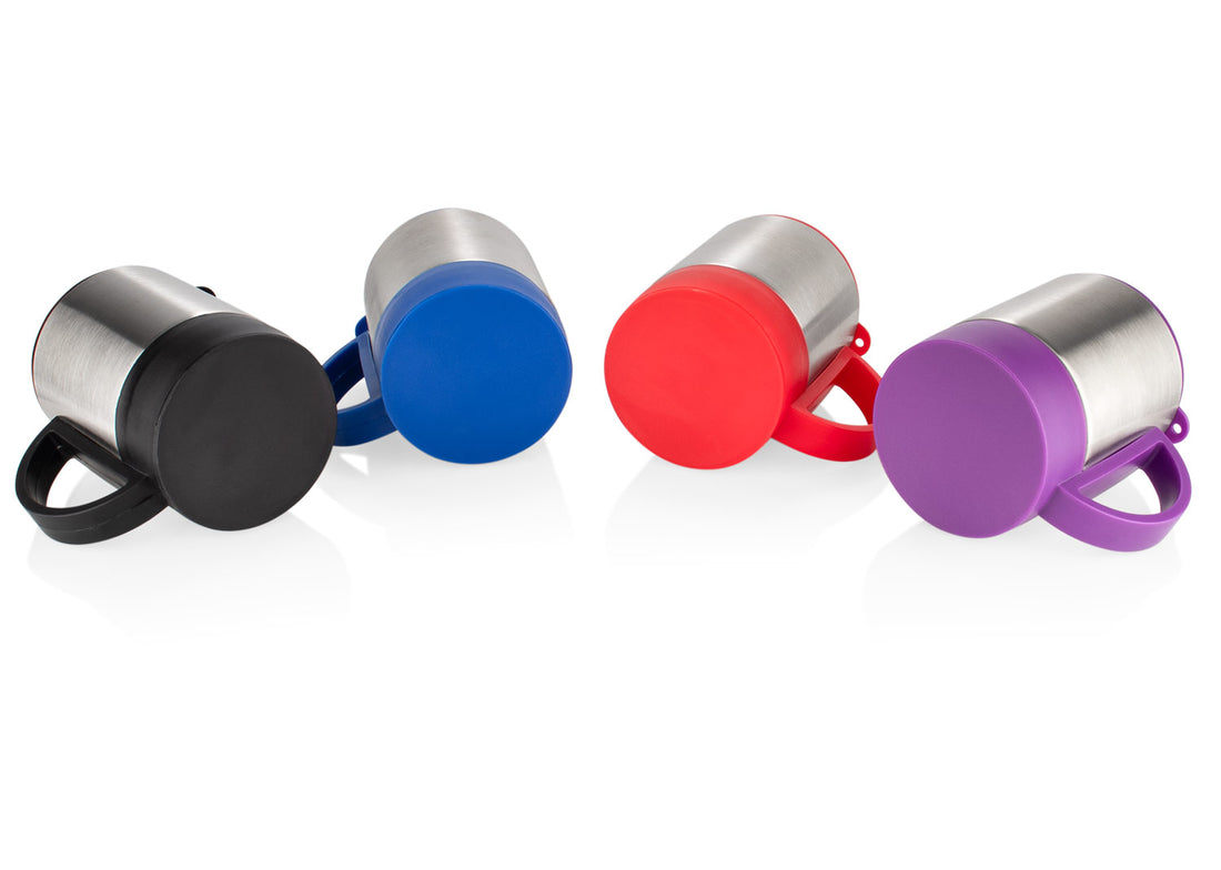 Mug doble pared en acero inoxidable y plástico. Con tapa rosca en plástico. Base antideslizante....