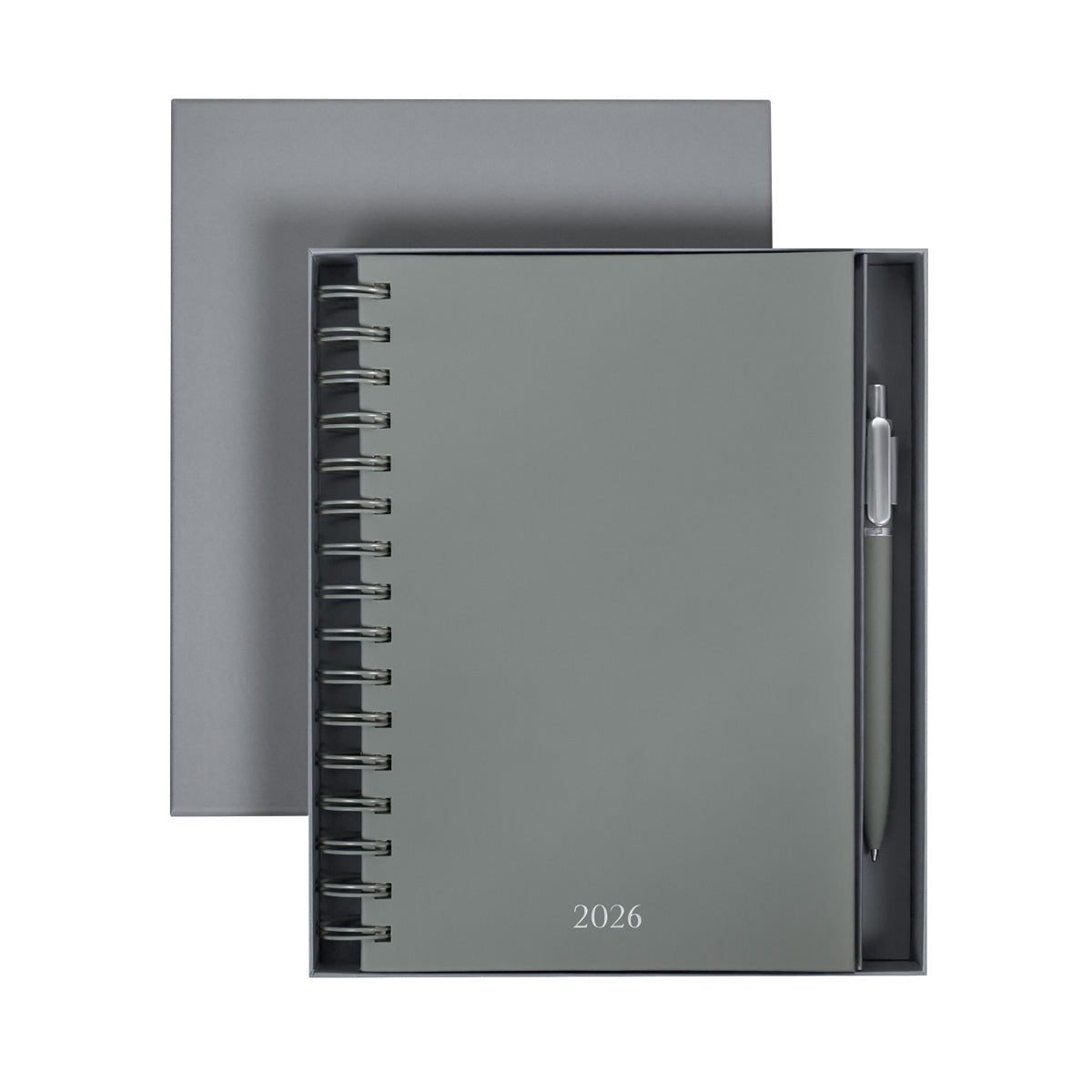 Descripción: Agenda diaria con 174 hojas. Contiene datos personales, calendarios 2025-2026-2027, planeador 2026 y seguimiento de nuevos habitos. Incluye boligrafo metalico y caja individual tipo regalo. | |