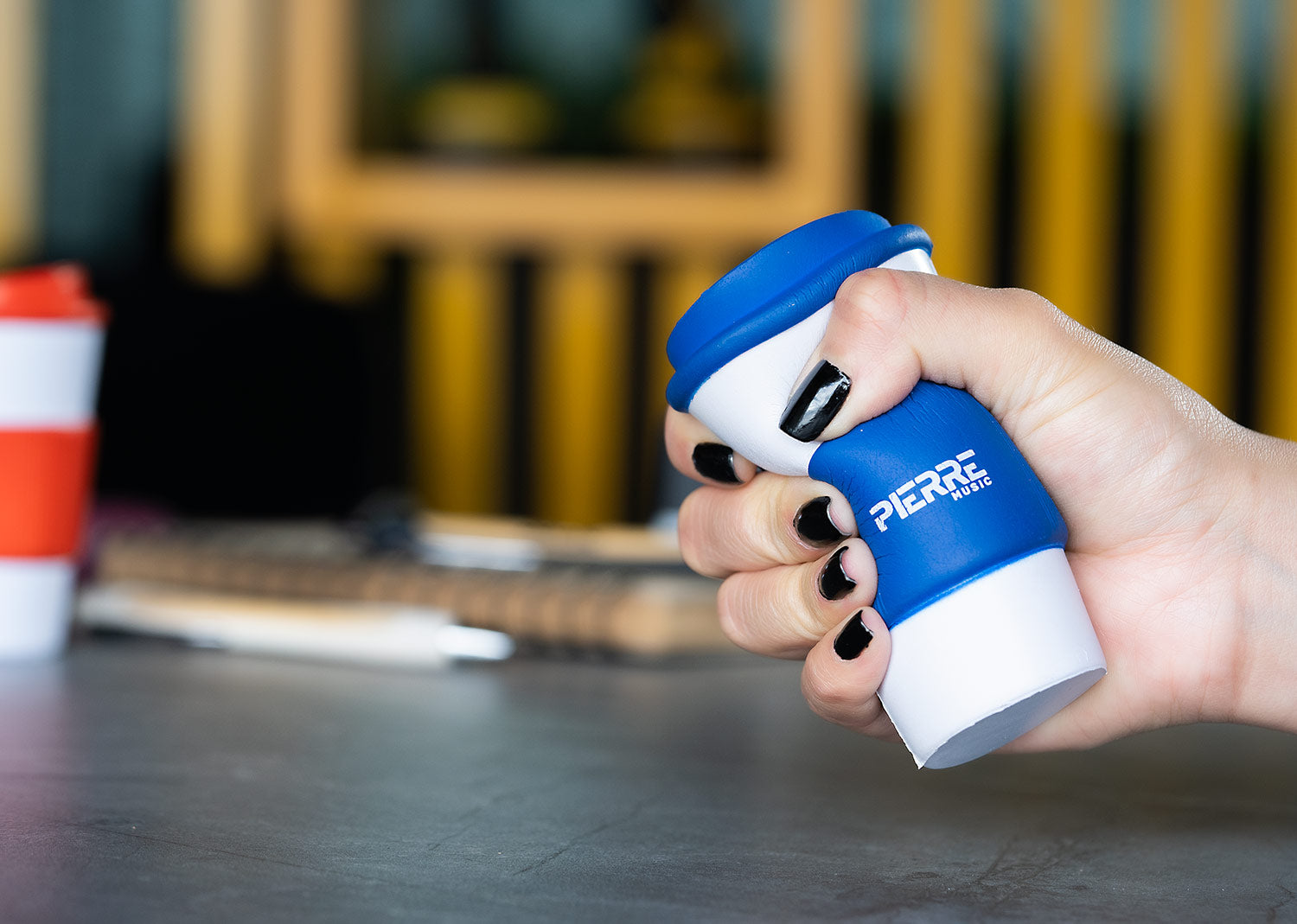 Artículo antiestrés con forma de vaso para aliviar la tensión.