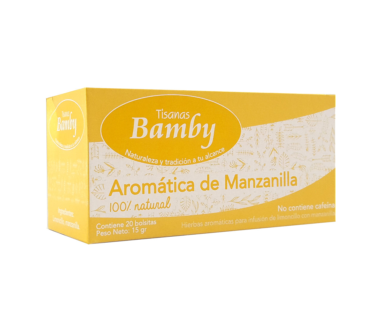 Aromática de Manzanilla de la marca BAMBY es una infusión elaborada con flores y plantas naturales, reconocida por sus propiedades relajantes y digestivas. Se recomienda para calmar la pesadez después de comer, aliviar dolores estomacales y hasta en casos de úlceras o gastritis.