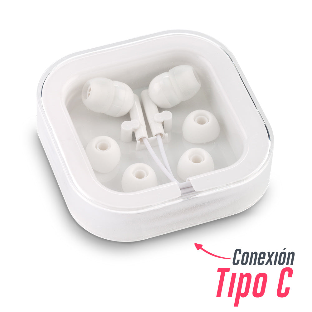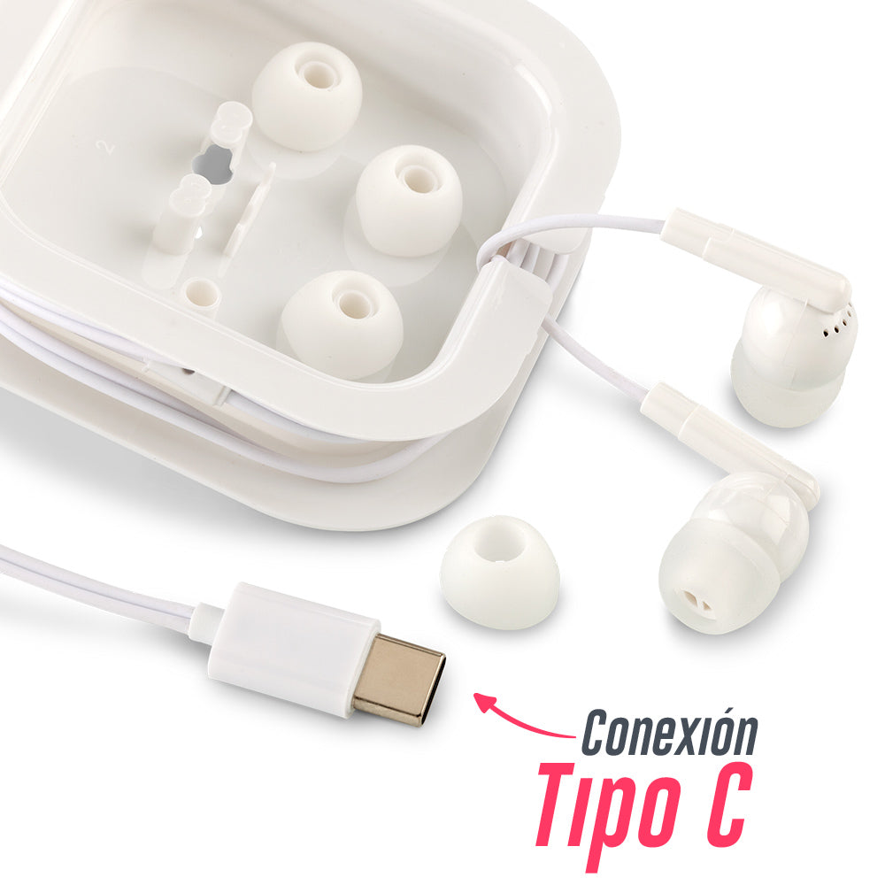 Audífonos Tipo C. Con siliconas de reemplazo en estuche plastico. Cable de 114 cm.