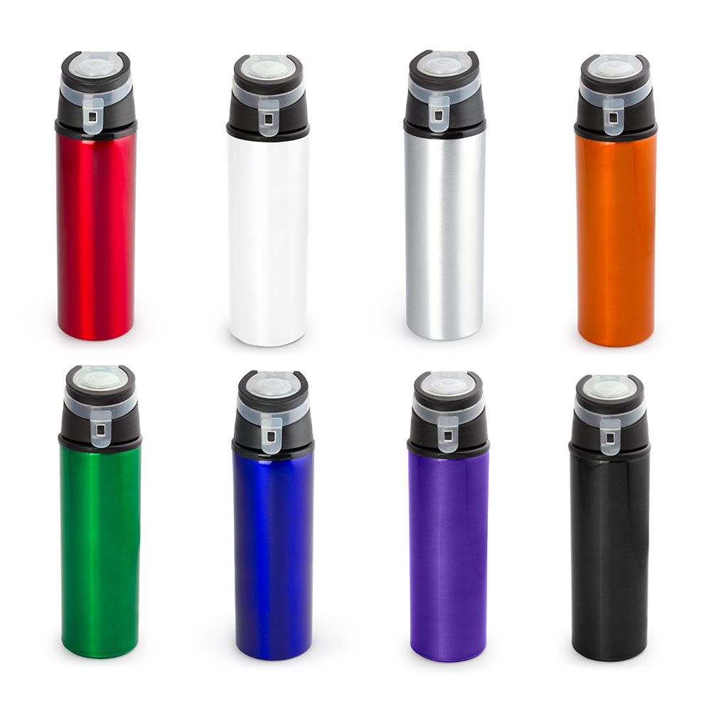Botella de aluminio con agarradera, tapa rosca y boquilla con cubierta plástica. Libre de BPA u otras sustancias nocivas. No retiene ni transmite sabores. Pintura exterior atóxica. Capacidad 650 ml / 23 Oz.
