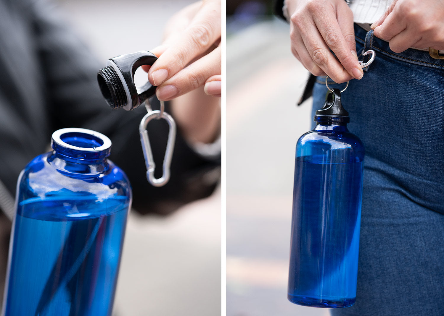 Botella de RPET con gancho carabinero, tapa rosca. Libre de BPA u otras sustancias nocivas. No retiene ni transmite sabores. Caucho en la tapa para evitar derrames. Capacidad: 700 ml / 24 Oz.