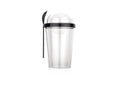 Contenedor plástico con tapa y compartimiento superior de cierre giratorio. Diseñado para ofrecer practicidad y organización, cuenta con una cuchara integrada (2,1 X 13,2) que facilita el consumo directo. Su sistema de cierre giratorio asegura un almacenamiento hermético, ideal para transportar alimentos secos o snacks de forma segura. Capacidad: 450 ml / 15 Oz.