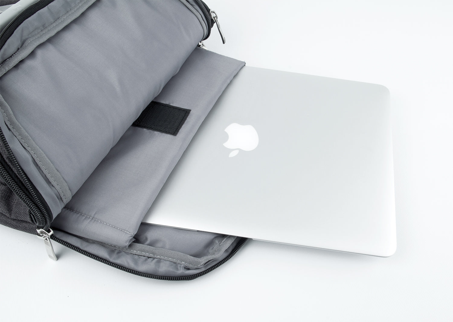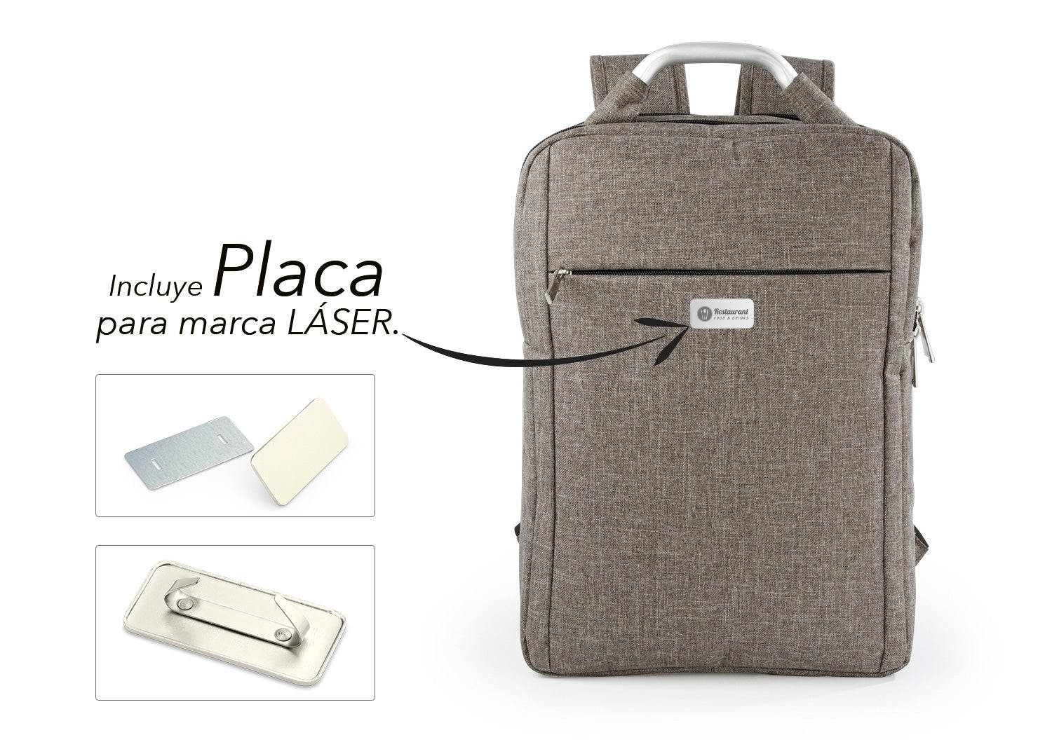 Morral con cargaderas ajustables acolchadas, agarradera en aluminio, bolsillo medio con compartimientos utilitarios en el interior, bolsillo principal con compartimiento para portátil de 14". Incluye placa para marca láser. Volumen aproximado: 14 litros.