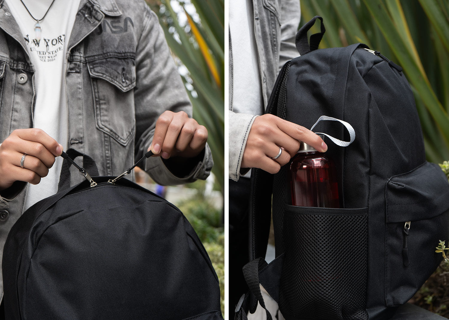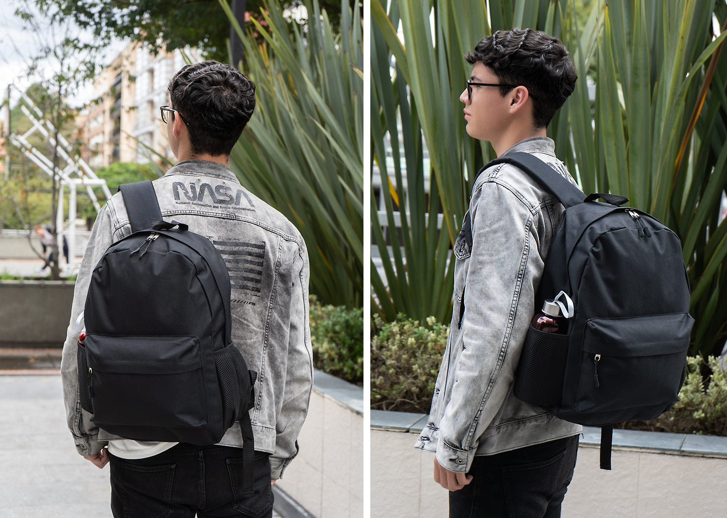 Morral para laptop con respaldo ergonómico, cómodo y ajustable. Cuenta con un bolsillo principal con cremallera y espuma en la parte trasera, así como un bolsillo frontal complementario. También tiene dos bolsillos laterales de malla ideales para botellas o cables. Volumen aproximado: 16 litros.