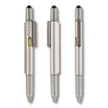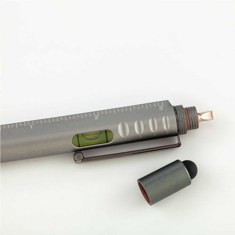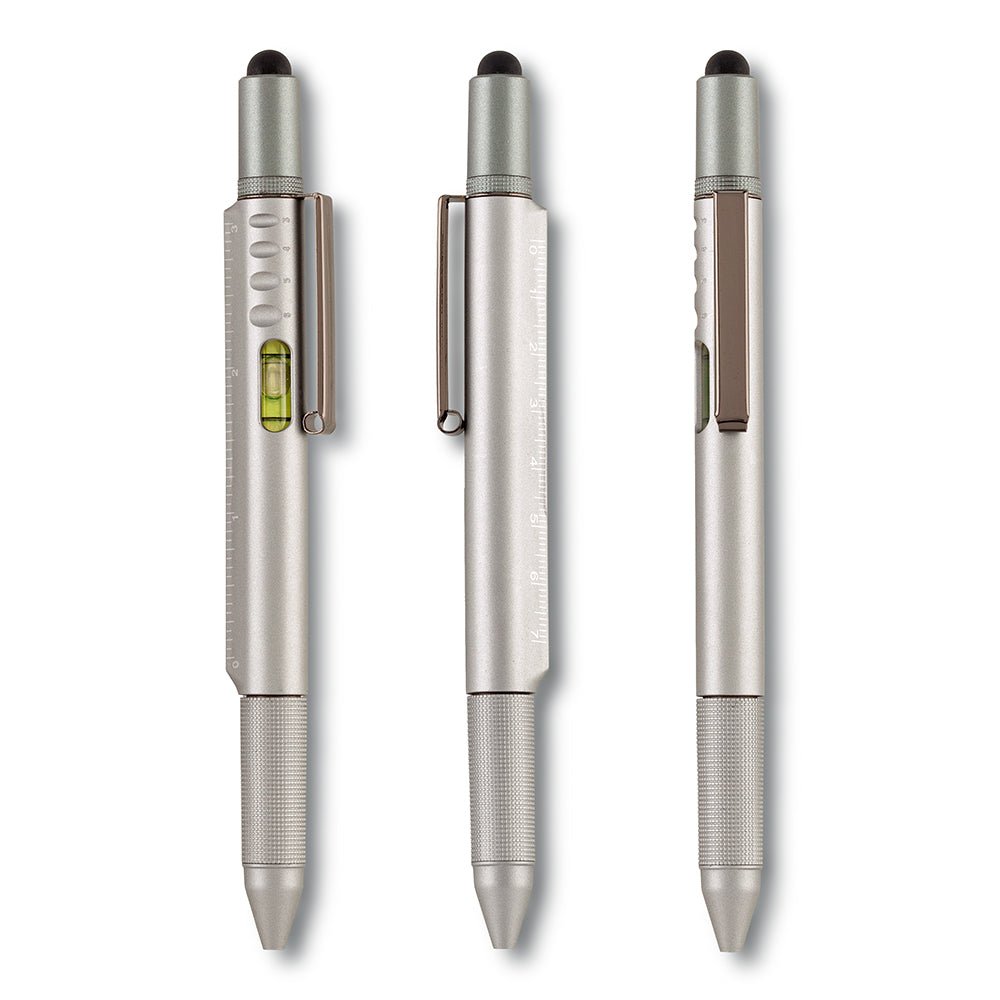 Bolígrafo plástico con clip metálico y stylus. Incluye regla de 7 cm, 1 nivelador, 1 destornillador de pala y 1 de estrella.