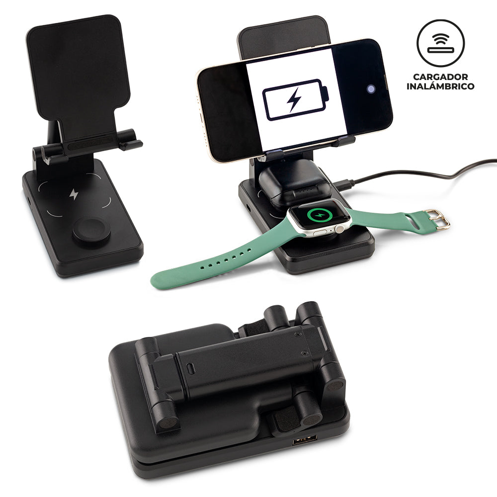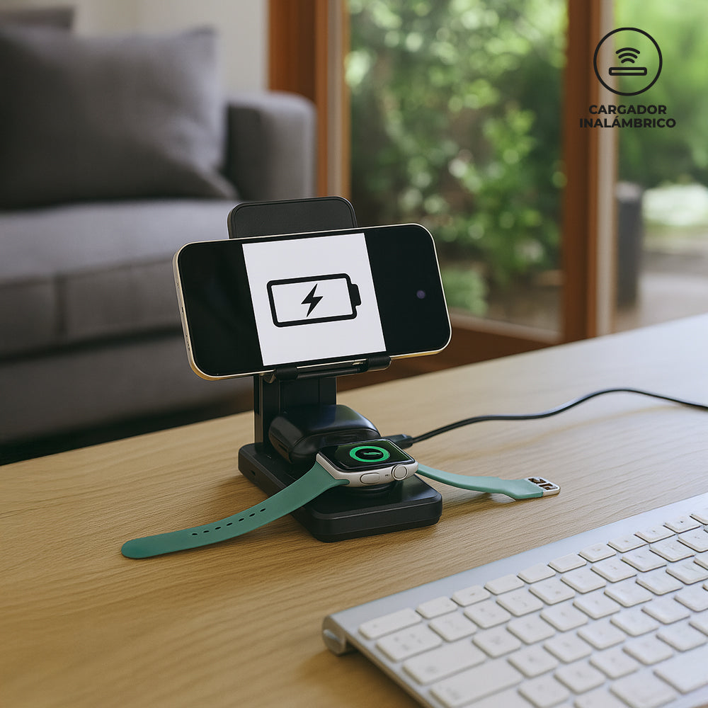 Carga teléfonos móviles (15W), audífonos (5W) y relojes Samsung / Apple (2W).
