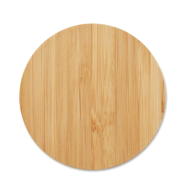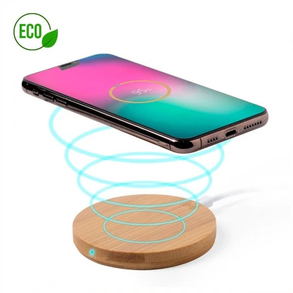 Cargador inalámbrico elaborado en bambú. Carga de 10 W. Input:9V-2A / Output: 5V-2A. Incluye cable USB.