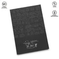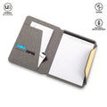 Folder tamaño A4 en poliéster reciclado RPET. Block de notas de 20 hojas con rayas. Cuatro compartimientos internos para trajetas y un compartimiento interno para documentos. Cierre en bambú con imán. Empaque caja individual.