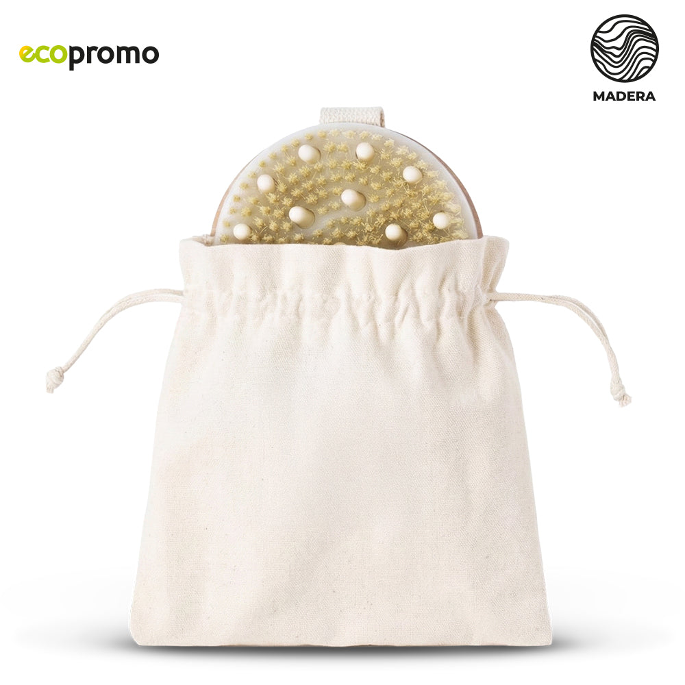 Cepillo y masajeador para limpieza facial en madera natural. Con bolsa en algodón.