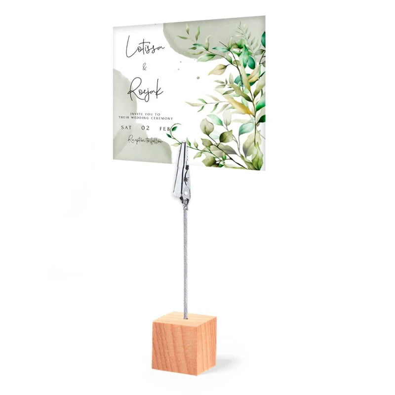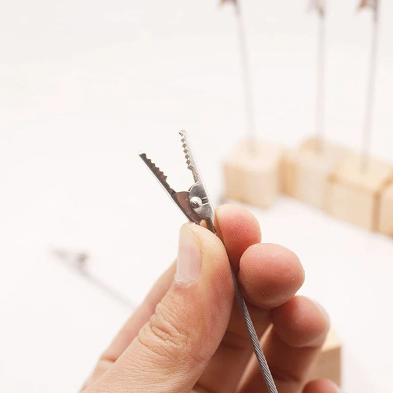 Clip en madera de bambú con guaya y clip metálico. De 2.5 x 2.5 cm.