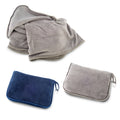Cobija 100% en poliéster de doble uso. Puede ser usada de dos maneras: de cobija si se abre y de almohada cuando se compacta y se cierra. Bolsa en poliéster con cremallera, carabinero y reata frontal.