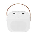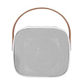 Parlante Bluetooth estéreo con Radio FM, tarjeta TF y entrada AUX. Estructura plástica color blanco y asa en poliuretano color marrón. Cable de carga y conexión USB-C en color blanco. Incluye manual de uso.
