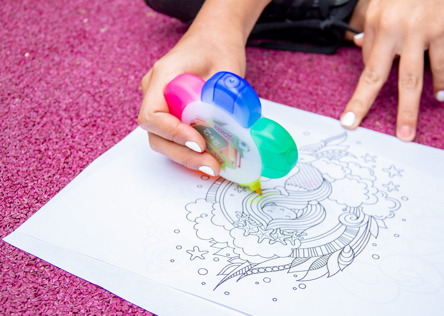Resaltador en forma de flor, con 5 colores de tinta: azul, rosado, naranja, amarillo, verde.