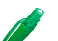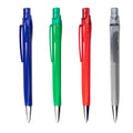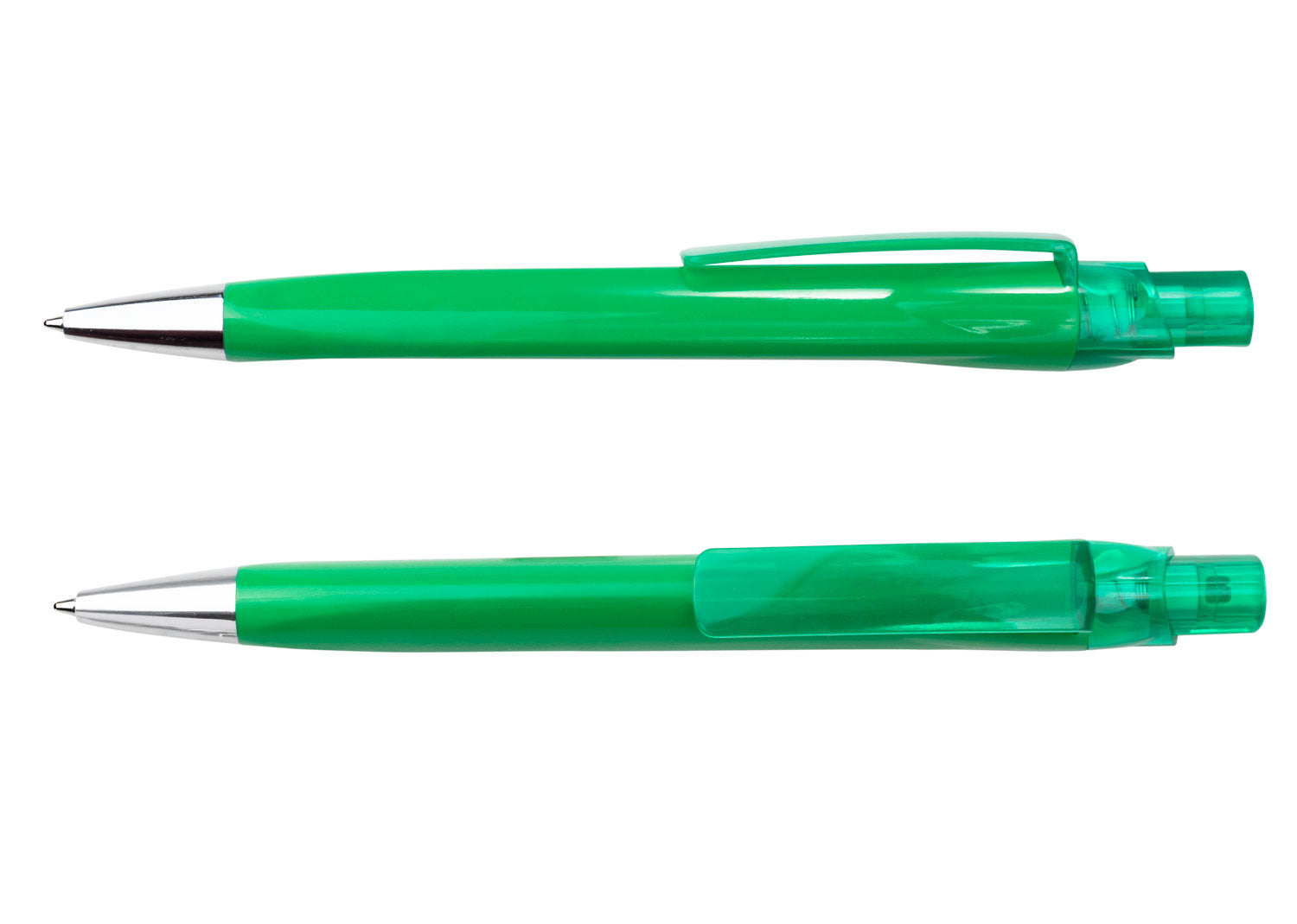 Bolígrafo con barril de color sólido, clip y empujador en acabado transparente, y punta cromada que aporta un toque moderno al diseño. Su estructura liviana y funcional lo hace ideal para uso diario en distintos entornos.
