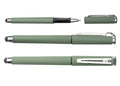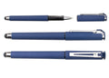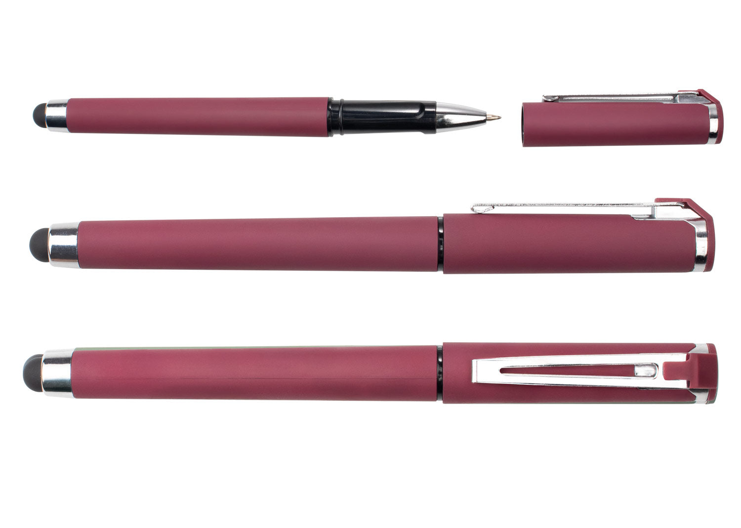 Bolígrafo roller con diseño moderno y funcional, cuenta con barril y tapa en acabado tipo goma de color, empuñadura ergonómica en negro para mayor comodidad, clip metálico cromado y detalles decorativos también cromados que realzan su estilo. Incorpora stylus para pantallas táctiles, ideal para entornos digitales. Su tapa se ajusta bajo presión, asegurando protección y practicidad en el uso diario.