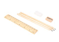 Este juego de lápices viene en una caja de papel que incluye tres lápices (17,7 X Ø 0,4), una regla de madera con medidas en centímetros (15) y pulgadas (6"), un sacapuntas (1,6 X 2,7 X 1,1) y borrador (3,5 X 1,9 X 1) en su interior. Es una opción práctica y compacta para llevar lo esencial de papelería en un solo estuche.