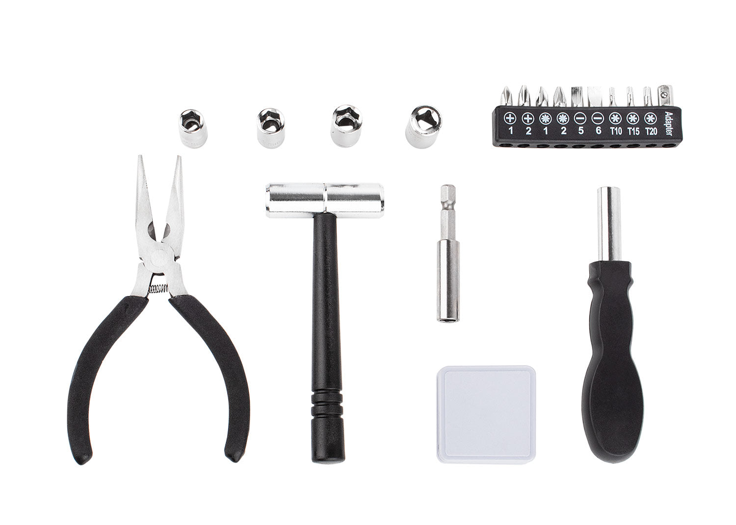 Set de herramientas que incluye: destornillador con 4 puntas tipo phillips, 2 tipo pala, 3 de precisión y 1 adaptador de copa. 1 extensor, 4 copas de 10, 9, 8 y 7 mm, pinza con cortafríos, martillo y cinta métrica de 102 cm y 40 pulgadas.