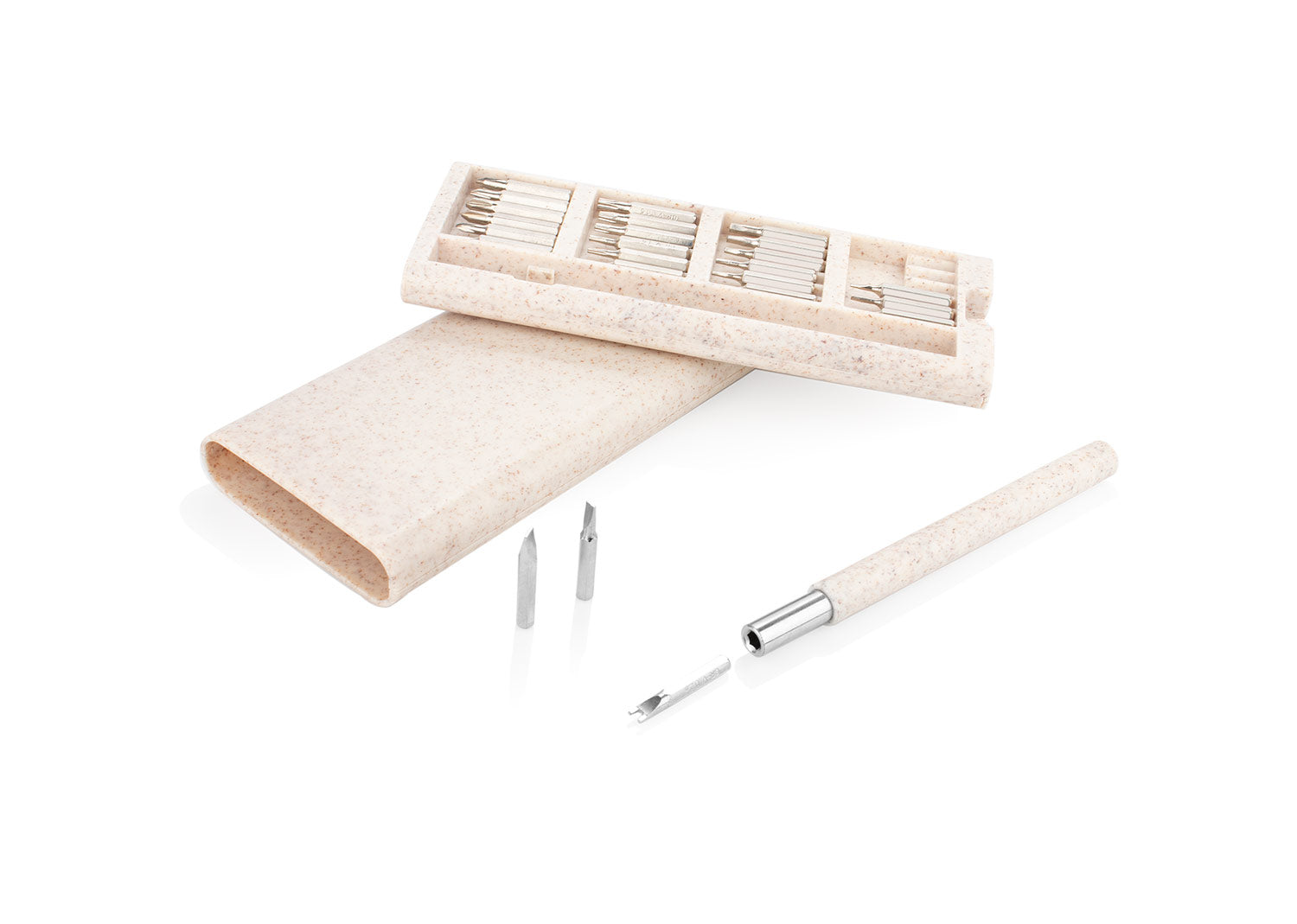 Juego de destornilladores empacado en carcasa de paja de trigo, consta de 24 piezas con tamaños para las diferentes necesidades.