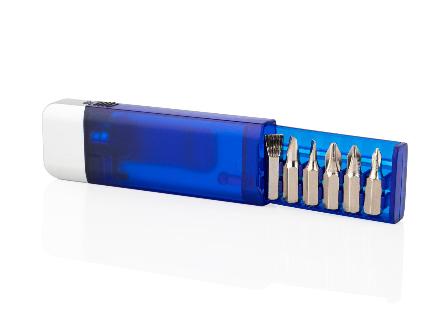 Este herramientero multifuncional cuenta con una linterna que se activa al deslizar un botón lateral. En la parte inferior incluye un compartimiento desplegable con seis puntas de destornillador, que pueden colocarse en la parte superior para su uso. El compartimiento se cierra bajo presión para mantener las piezas seguras. Además, incorpora un clip lateral que permite sujetarlo fácilmente a la ropa, ideal para llevarlo siempre a la mano.