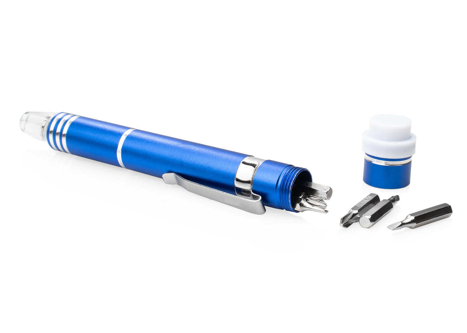 Práctico y versátil herramientero con clip, ideal para llevar siempre a mano. Cuenta con una tapa de presión que asegura el botón de encendido de la linterna integrada, brindando funcionalidad adicional en cualquier situación. En la parte superior incorpora un cierre giratorio que almacena 6 puntas de destornillador intercambiables, las cuales se insertan fácilmente en la punta del herramientero para realizar reparaciones rápidas y precisas. Su diseño compacto y metálico lo convierte en una herramienta indispensable para el día a día.