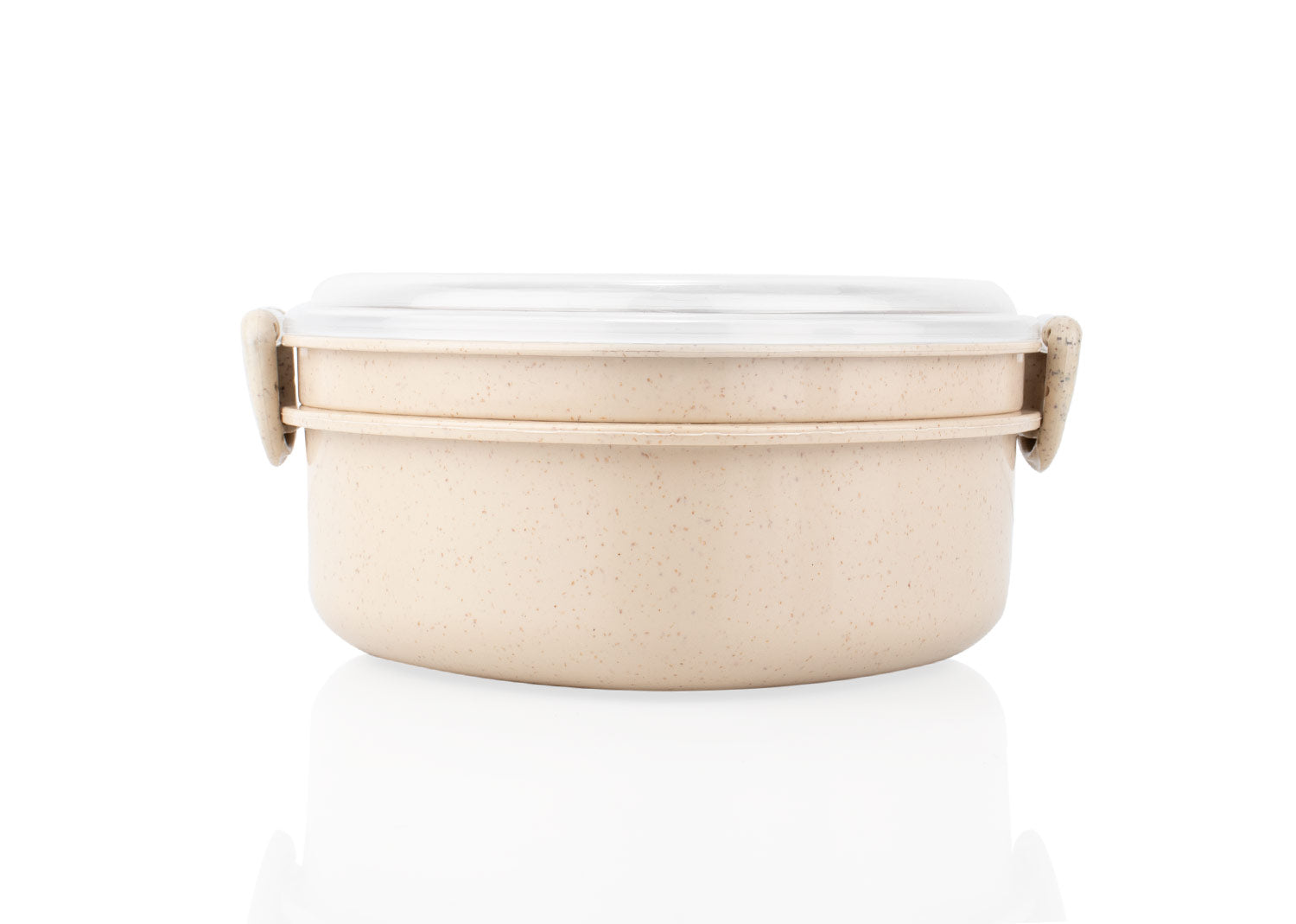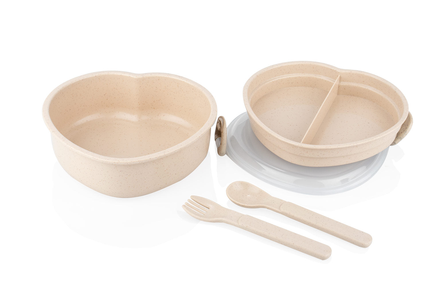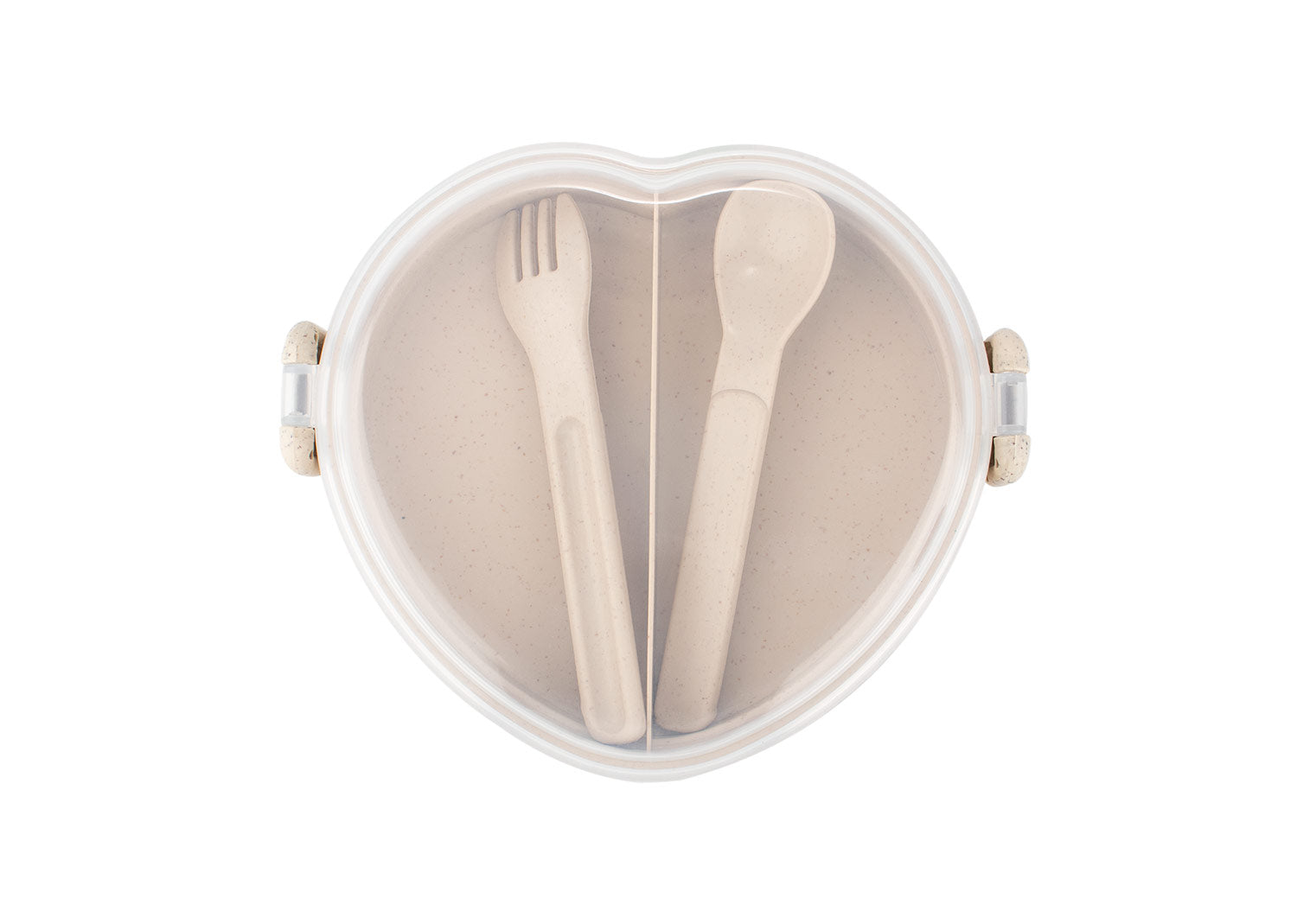 Con diseño en forma de corazón, fabricada en material de paja de trigo con tapa de PP transparente. Incluye cuchara (2,7 X 12,2) y tenedor (2,3 X 12,2) del mismo material y color que la base, ubicados en un compartimiento adicional (14,2 X 13) para mayor organización. La tapa cuenta con cierres laterales que aseguran un cierre firme. Una opción ecológica y funcional para transportar tus comidas con estilo.