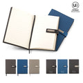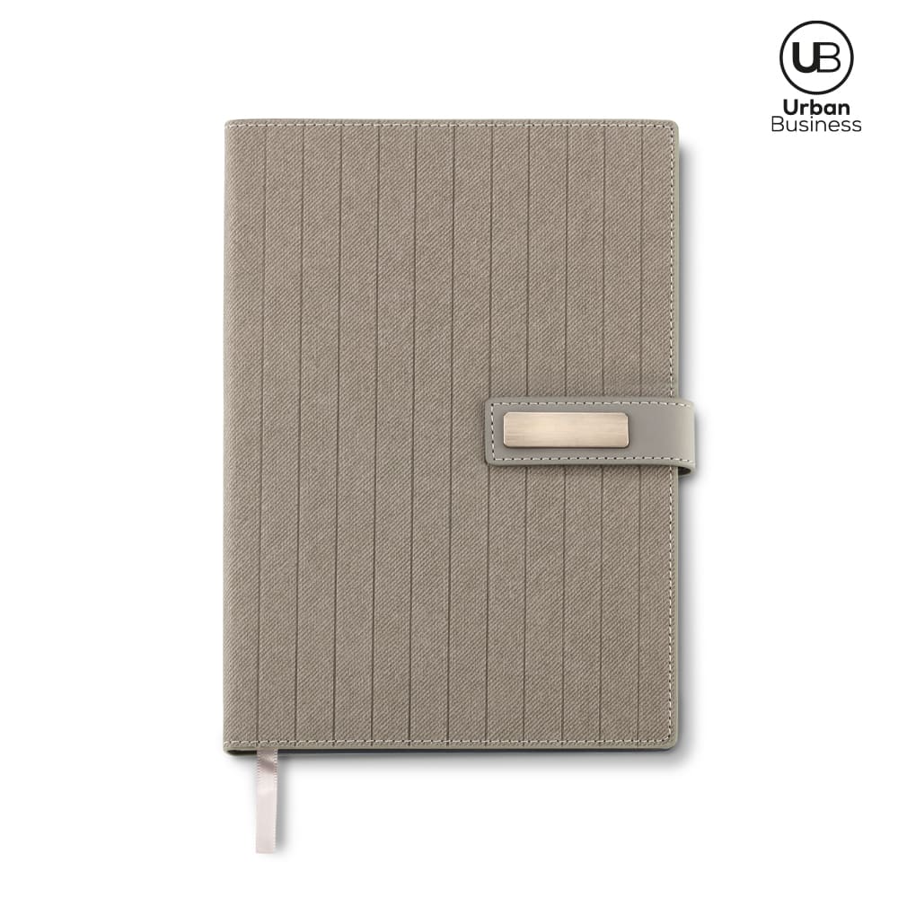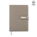 Libreta en poliuretano con cierre imán. 96 hojas rayadas. Incluye placa para marca. Empaque caja individual.