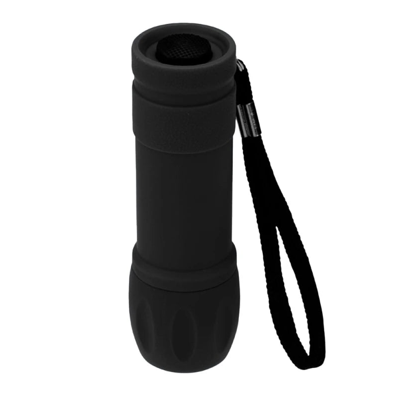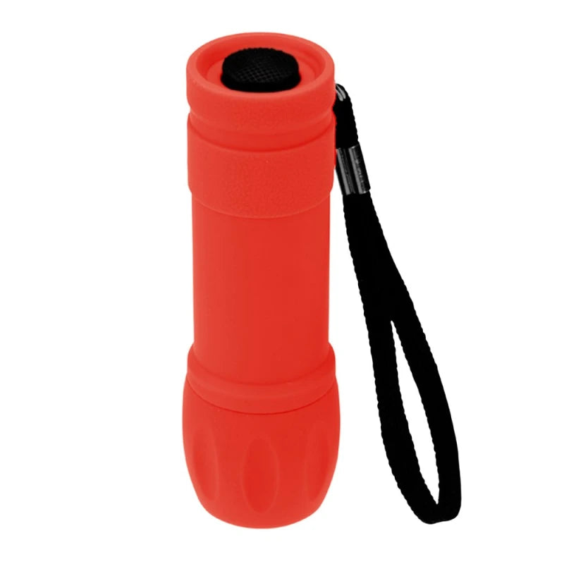 En caucho con 9 luces led. De 9.5 x 2.5 cm. Incluye cordón para colgar. No incluye baterías.