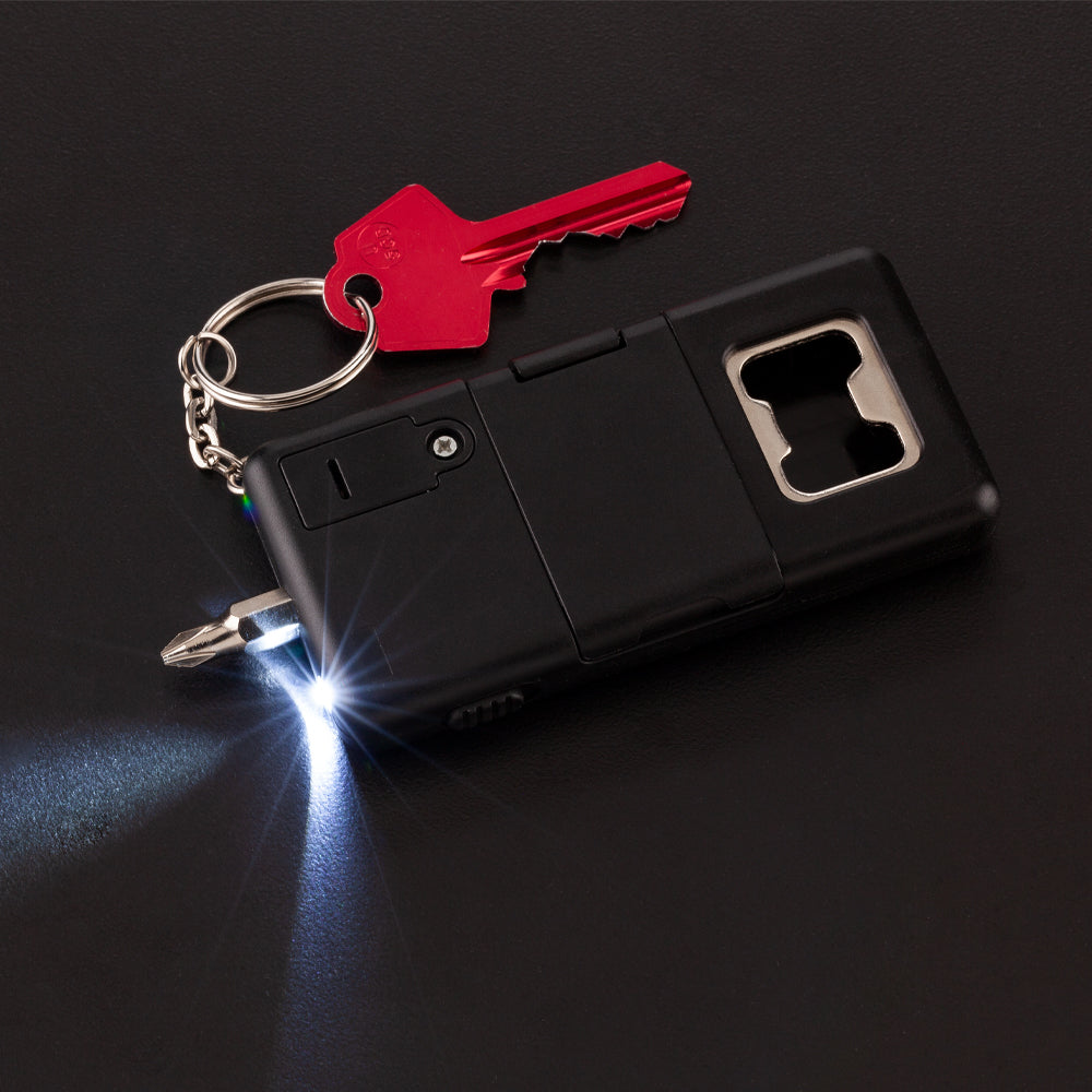Llavero plástico con cuatro puntas de destornilladores, destapador y linterna.