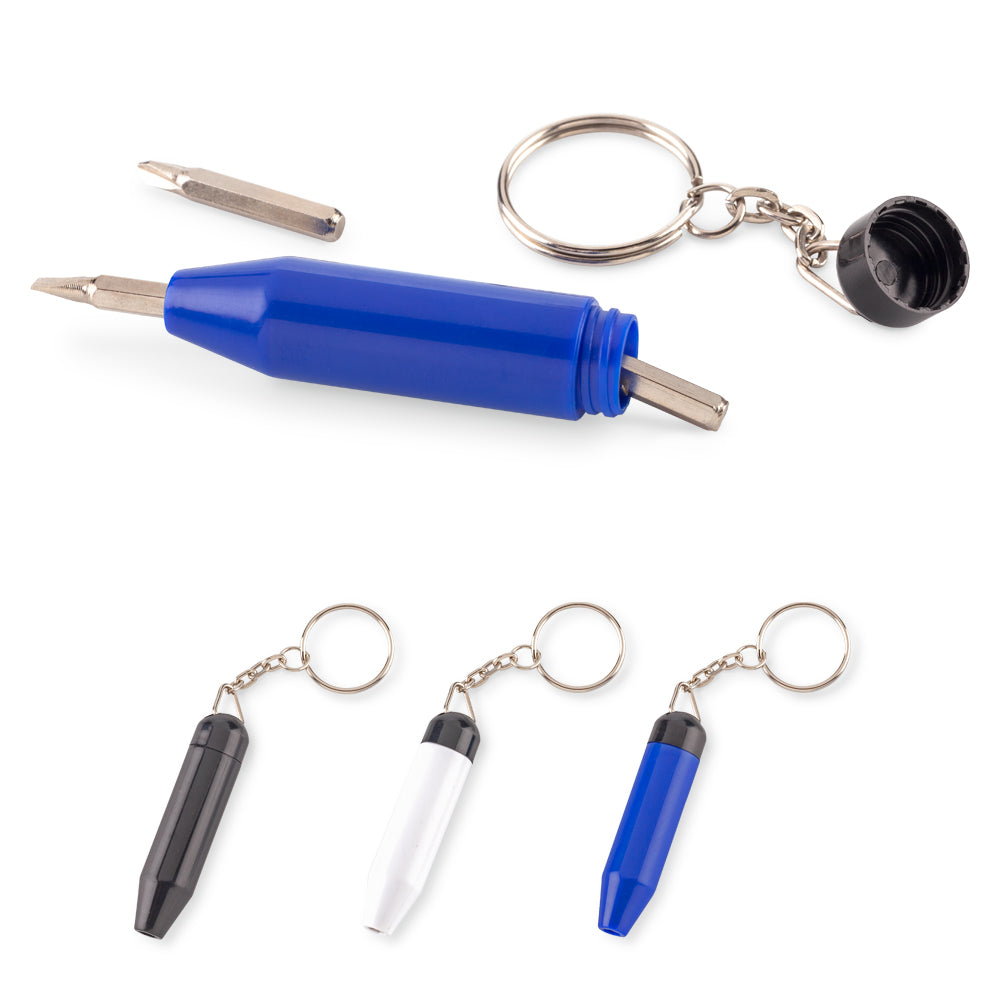 Mini set de destornilladores en estuche plástico que funciona como mango de agarre.