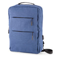 Morral backpack en poliéster. Con cuatro bolsillos externos con cremallera. Apto para portátil de 15”. Puerto USB para cargar desde el interior (no incluye pila). Espaldar acolchado.