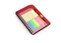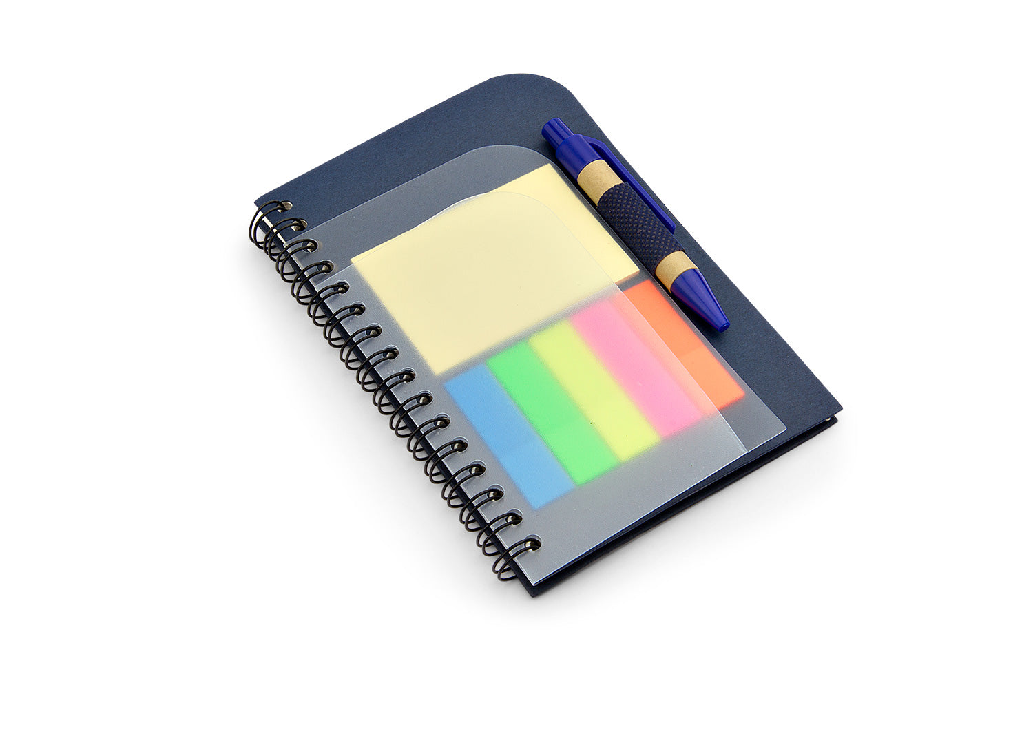 Libreta con cubierta en acetato grueso y cartón de colores, memo adhesivo por 25 und y 5 set de 25 banderitas PET adhesivas de colores y mini bolígrafo incluidos. 40 hojas blancas Tamaño aproximado de la hoja A6.