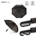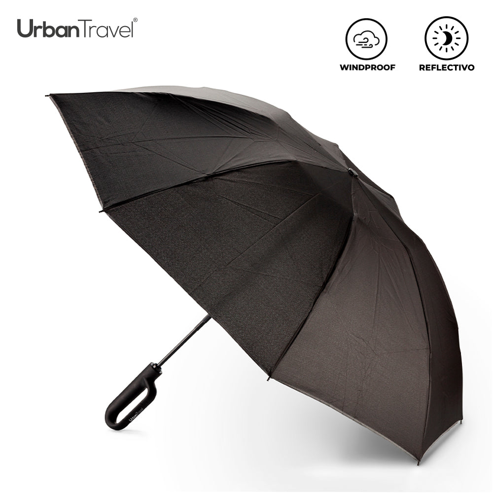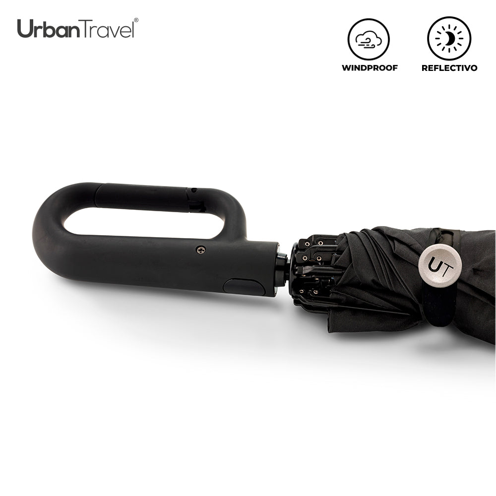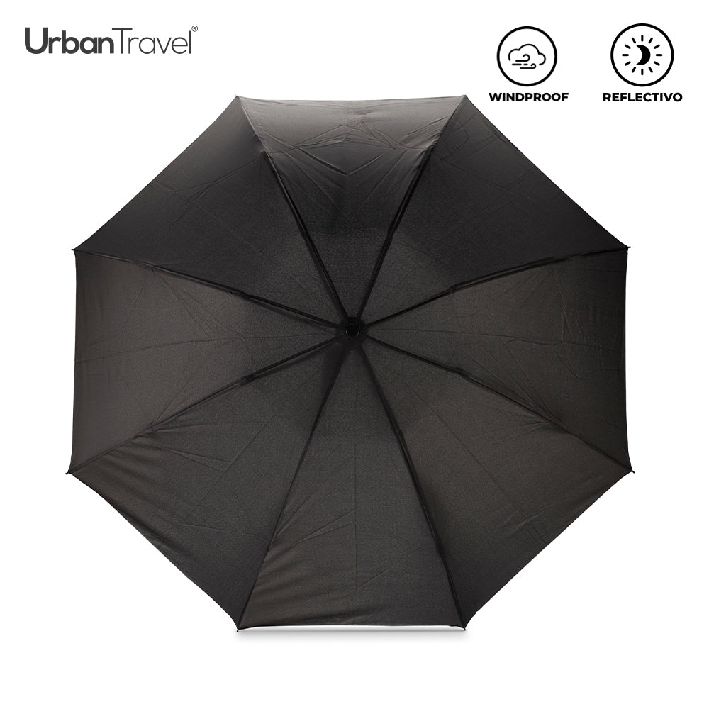 Paraguas plegable en poliéster pongee 190T con herraje en aluminio y bordes reflectivos. Apertura y cierre automático, 8 cascos. Mango tipo carabinero en caucho para poderlo colgar. Incluye funda reciclada RPET.