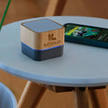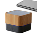 Altavoz hecho en bambú con base en silicona. Bluetooth 5.0, lector de tarjetas TF y 3W de potencia. Luz de colores. Batería de 300 mAh, autonomía hasta 4 horas. Función para atender llamadas, control de volumen y de música en el dispositivo. Incluye cable USB / Micro-USB. De 6 x 5,3 cm.