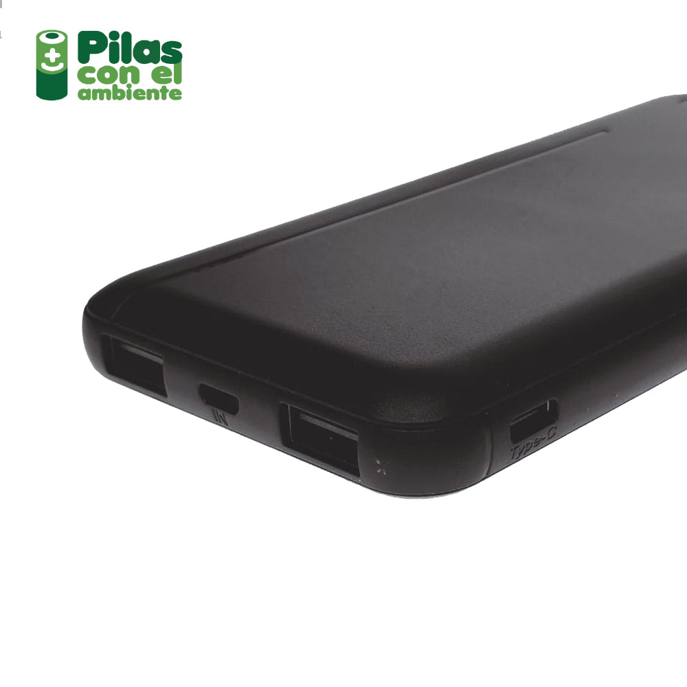 Pila plástica recargable de 10000mAh. Dos puertos USB, un puerto Tipo C, un puerto Micro. Incluye cable Tipo C para cargar la batería. Empaque caja individual.