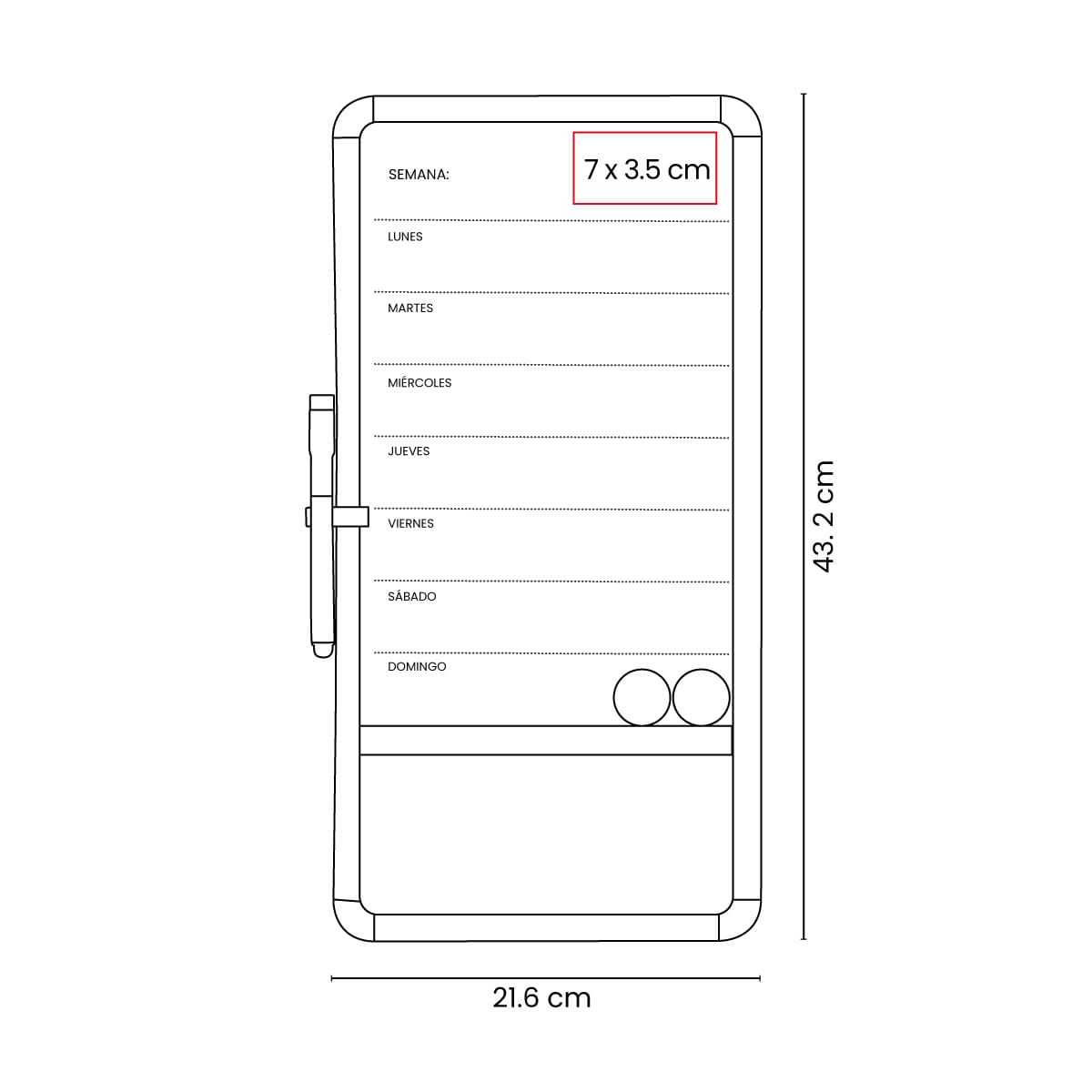 Descripción: Pintarron con planeador semanal ideal para organizar tus tareas mas importantes. Incluye marcador en color negro con borrador. Superficie magnetica para sujetar notas, mientras que la parte inferior cuenta con una seccion de corcho para colocar papeles o documentos. Gracias a su gancho en la parte superior, este pintarron es facil de colgar. Incluye dos imanes adhesivos para fijar en la pared. | |