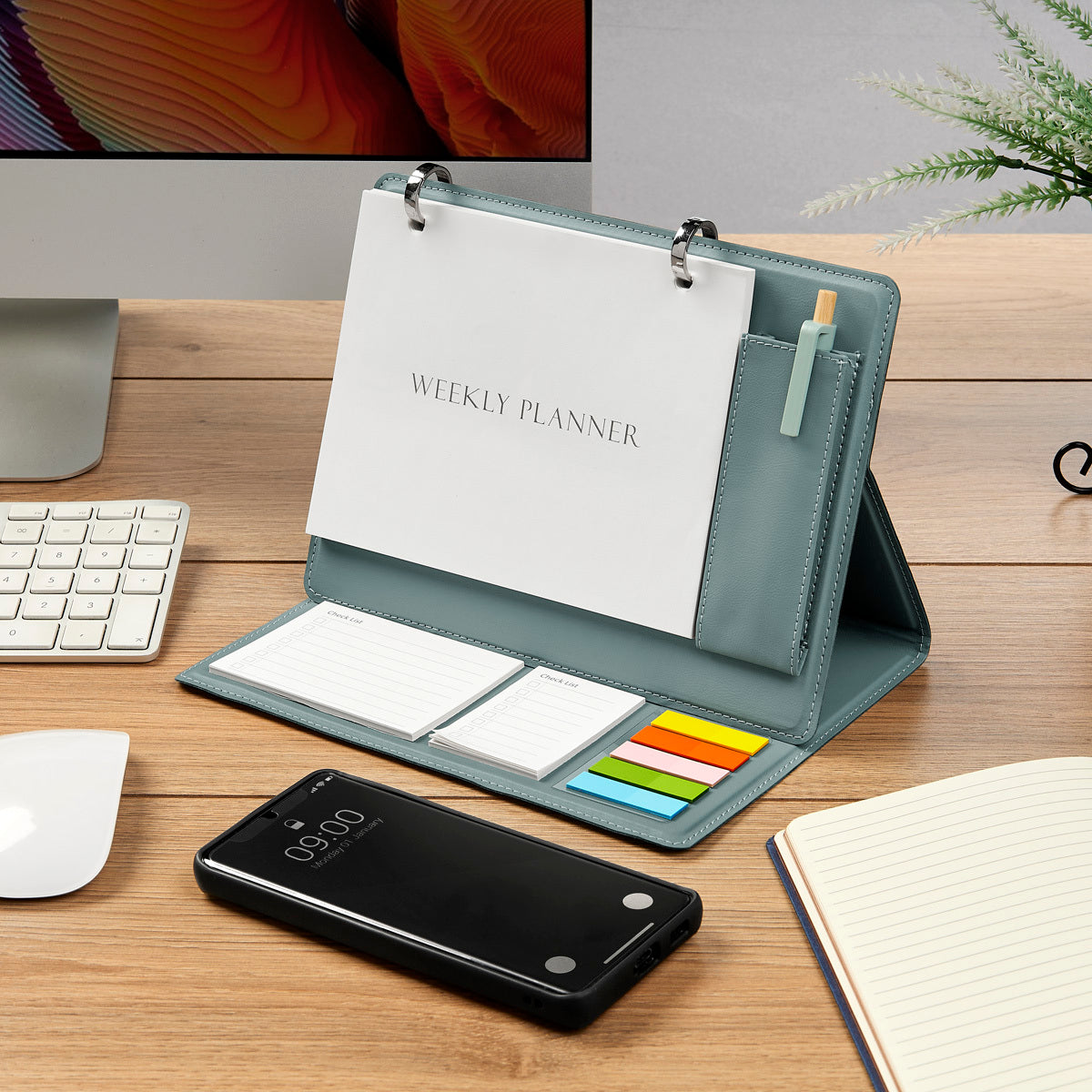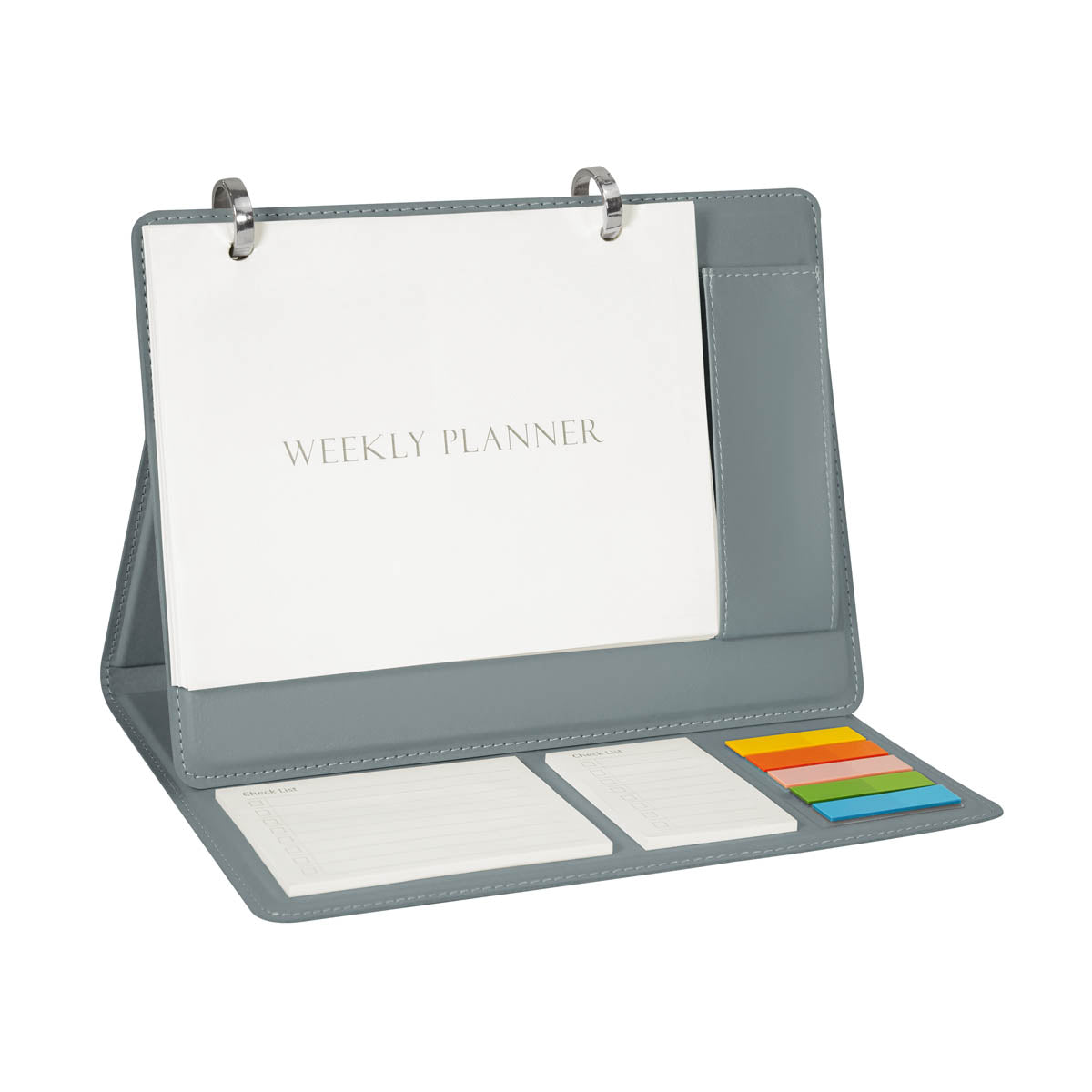 Descripción: Planeador semanal con diseno plegable. Cubierta de curpiel y dos aros metalicos. Incluye 40 hojas reticuladas y dos blocks de 25 notas cada uno, ademas de 5 colores diferentes de banderines con 25 notas cada uno y un porta plumas. Su diseno permite desplegarlo para tener tus apuntes a la vista y organizar tus tareas diarias facilmente. | |