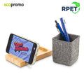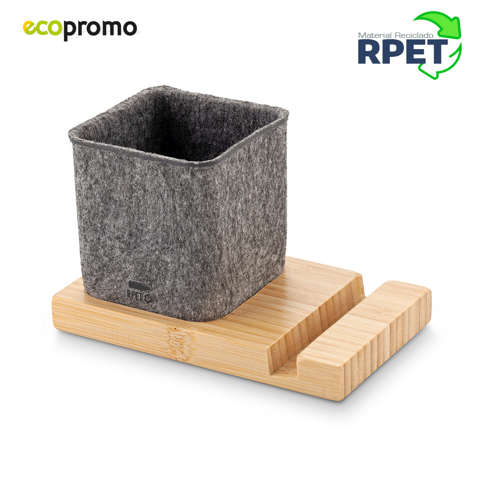 Portabolígrafos en RPET reciclado y base en bambú. Con soporte para celular. Empaque caja individual.
