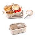 Portacomidas plástico con cuatro compartimientos, un compartimiento adicional con tapa y una cuchara / tenedor plegable.