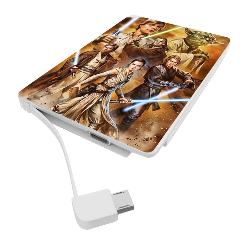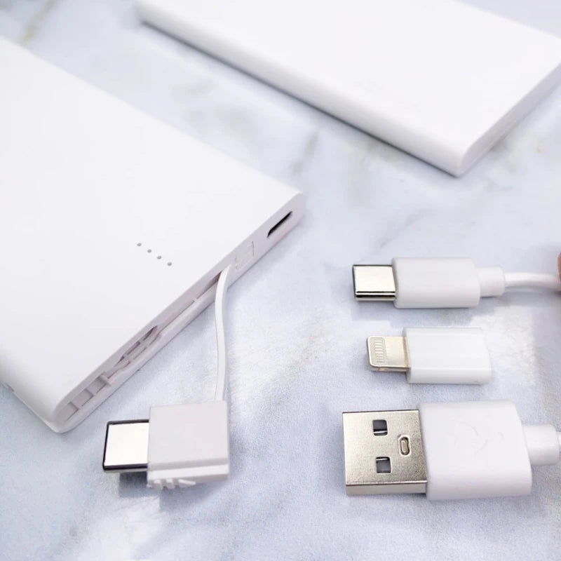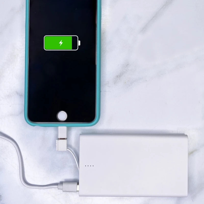 Batería recargable tipo tarjeta de 4000 mAh. Con cable tipo C de carga rápida y adaptador para iPhone. De 6.8 x 11.7 x 0.7 cm.