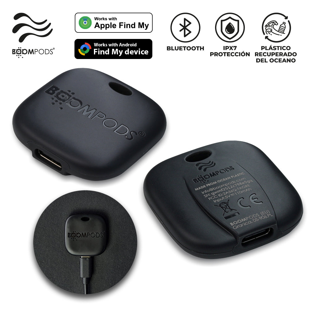 Rastreador universal plástico Bluetooth, hecho de residuos reciclados recuperados del océano, para llaves, carteras, mascotas, vehículos, equipaje y otros artículos. Permite ver la ubicación de los artículos en tiempo real. Compatible con IOS y Android. Resistente al agua (no sumergible), tecnología IPX7. La batería le dura hasta 5 meses con una sola carga, con puerto Tipo C para carga. Empaque caja individual.