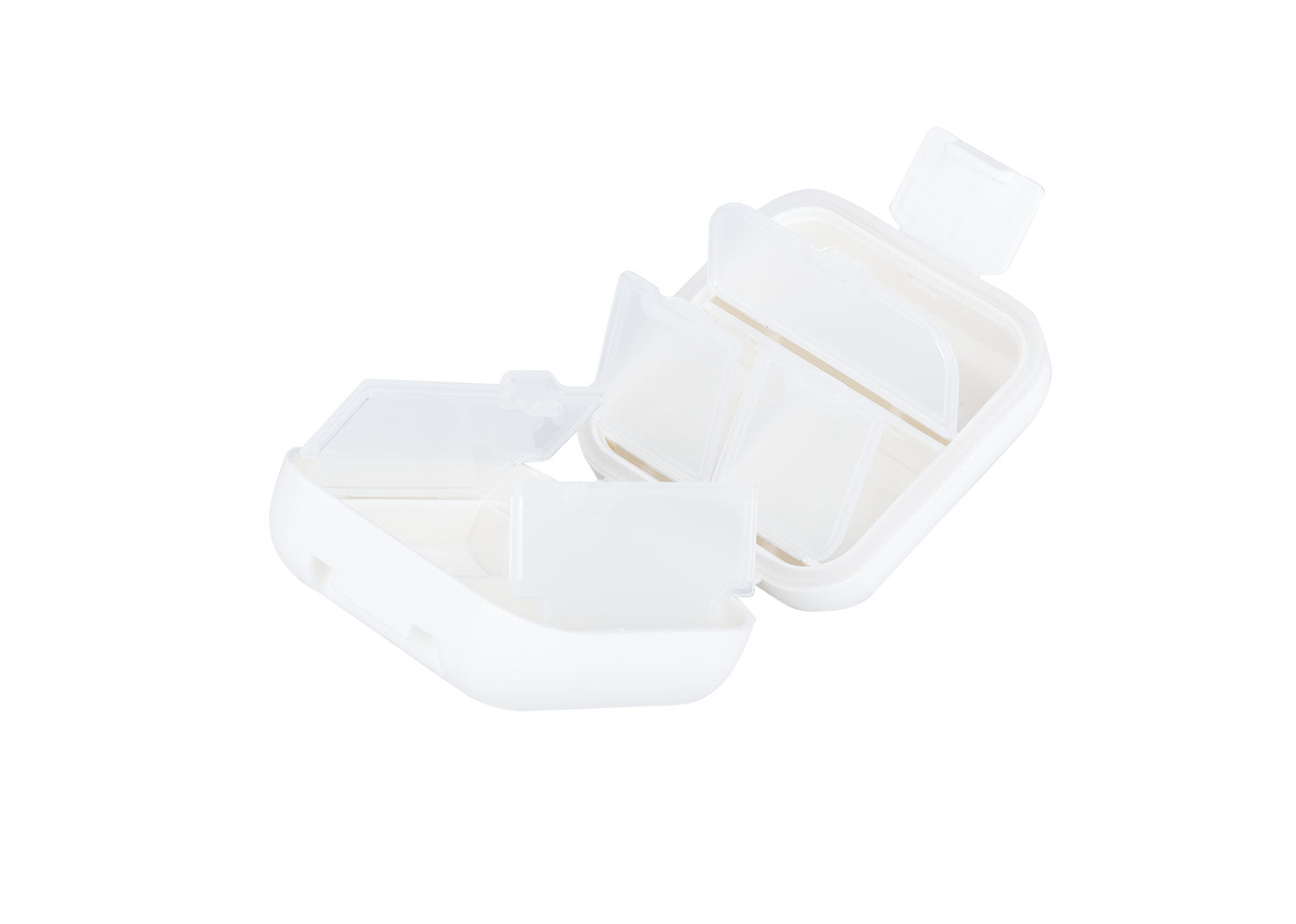 Pastillero plástico cuadrado de 5 compartimentos independientes con tapa transparente: 2 Compartimientos Grandes: (2,5 X 5,7). 1 Compartimiento Mediano: (5,2 X 2,1). 2 Compartimientos Pequeños: (2,5 X 2,7). Diseño compacto y cierre a presión que asegura un almacenamiento seguro. Ideal para organizar dosis diarias o semanales.